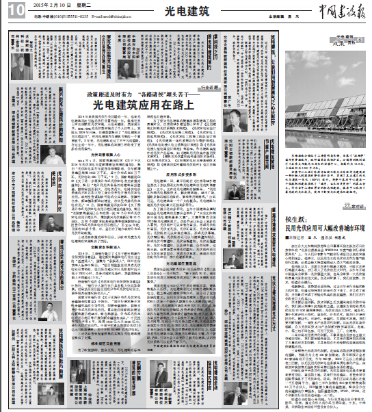 在中国建设报中刊登了jinnianhui金年会赵新伟总经理对光电建筑行业的新年寄语: 我国光伏演变史一步步都走得跌宕起伏。高耗能建筑已经成为能源消费的重要领域。光电建筑已经成为能源消费的重要领域。光电建筑既能使建筑节能降耗,更能提供清洁能源。金年会相信,光电建筑正以蹄疾步稳的姿态,在新一轮光伏革命征程上跃马前行! 在过去的几年中,金年会构件式光伏瓦产品被大量运用到了光伏电站项目中。江阴jinnianhui金年会将致力于光电建筑产品及应用的开发,让越来越多的人开始接受这个“新鲜的高科技玩意儿”。
