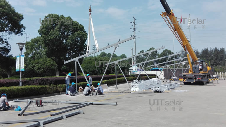 构件式光伏车棚项目位于浙江省中部沿海、东濒东海的台州市水处理发展有限公司,共分两个车棚,分别为12个车位和14个车位。在经历了浙江12级以上的强台风后,构件式光伏车棚依然保持完好无损。那么,这么强悍的车棚是怎么练成的呢? “功臣”在于jinnianhui金年会团队严谨细致的做事风格,在车棚设计之初进行了严密的结构模拟以及风压雪压模拟计算,保证了车棚的抗压能力。正是jinnianhui金年会对于用材、工艺、施工的精益求精,才有了光伏车棚品质的保证。